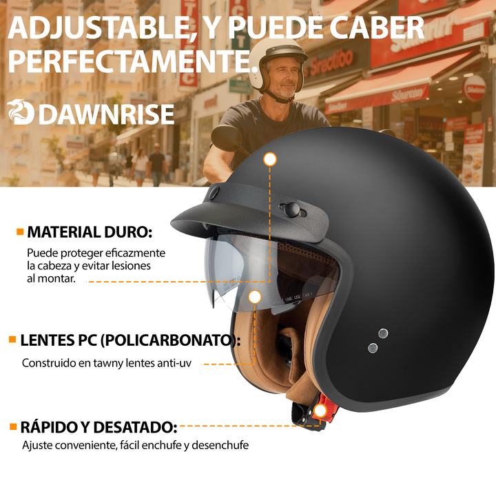 DAWNRISE Cascos Moto Jet para, diseñado para motociclistas que valoran tanto el estilo como la funcionalidad. Este casco convertible presenta elegantes colores sólidos y es adecuado para trabajar con cualquier motocicleta o scooter.Equipado con doble visera para mayor versatilidad en diferentes condiciones de conducción, ofrece una experiencia de uso superior. El interior está forrado con un acolchado suave en tono marrón que proporciona comodidad durante trayectos largos. Su diseño versátil lo hace ideal tanto para hombres como para mujeres. El sistema de ventilación integrado ayuda a mantener una temperatura óptima, mientras que su construcción ligera reduce la fatiga durante el uso prolongado. El cierre seguro y los acabados de calidad demuestran la atención al detalle en su fabricación. Este casco jet es perfecto para uso urbano y viajes cortos, combinando practicidad con un diseño moderno.
